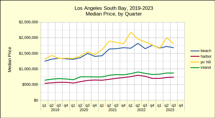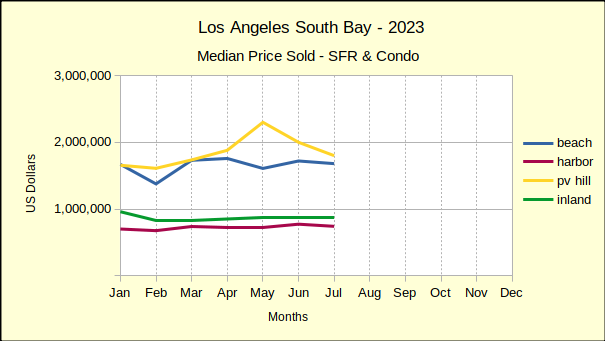 Year to date for thefirst seven months of 2023 compared to 2022 looks much the same. Thenumber of homes sold dropped by 22%, 799 in 2023 versus 1021 lastyear. The median price fell 2% to $868K from $883K. Looking back tothe 2019 sales volume for the same time period, the Inland area isoff by 18% for the current year. Much like the rest of the South Bay,the median price in 2023 ($868K) remains above that of 2019 ($662K)by 31%.