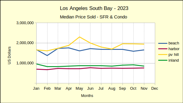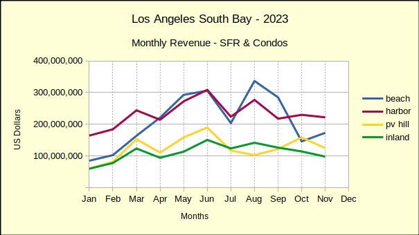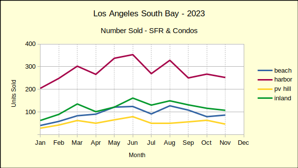 After having risen in September by 14% and in October by 13%, the number of homes sold on the Hill fell by 27% in November. Of course, part of the decline is seasonal. However, month to month sales volume for the first 11 months of 2023 was off by 19% in Palos Verdes with a similar drop of 16% overall for the South Bay.