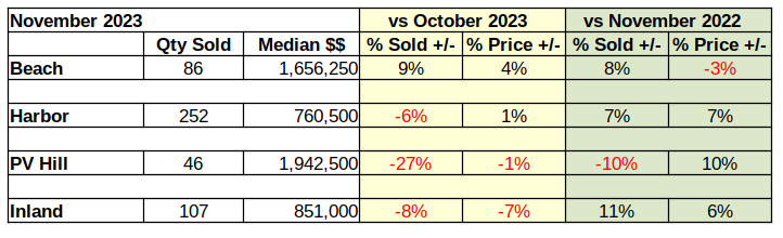 Compared to November of 2022, both sales volume and median price climbed by 7% last month. This is the second month of solid upward figures for residential home sales in the Harbor area. Sales figures for the area have been in red ink since the beginning of the year, so these are welcome statistics for home owners wishing to sell.